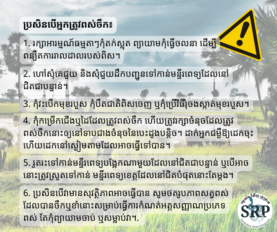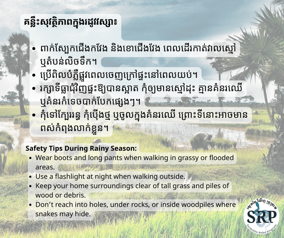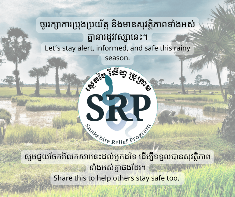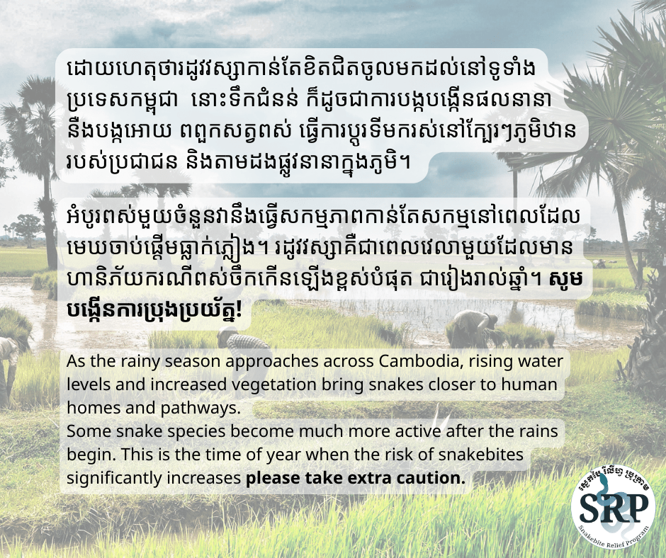 As the rainy season approaches across Cambodia, rising water levels and increased vegetation bring snakes closer to human homes and pathways. Some snake species become much more active after the rains begin. This is the time of year when the risk of snakebites significantly increases—please take extra caution.