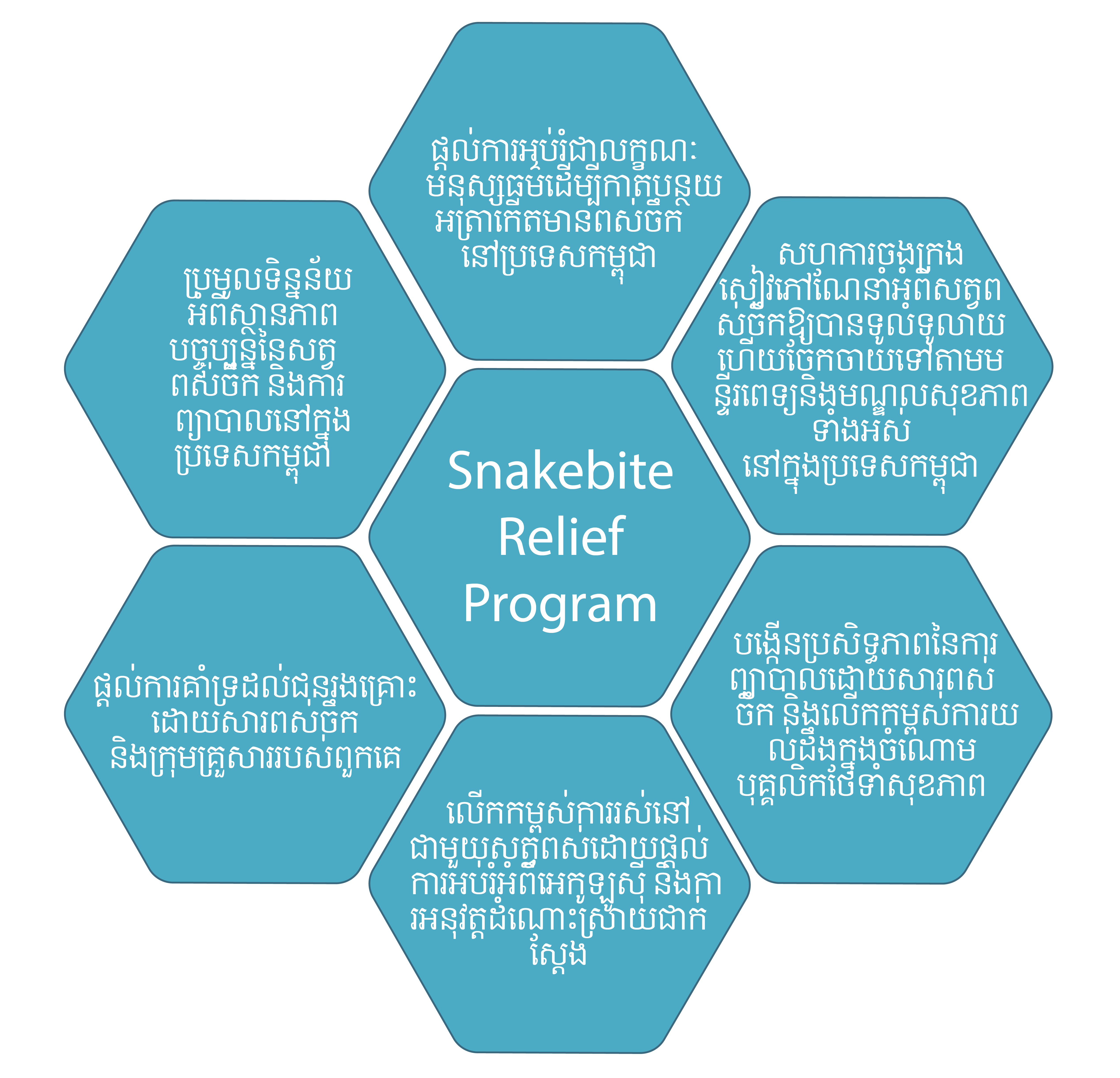 សហការចងក្រងសៀវភៅណែនាំអំពីសត្វពស់ចឹកឱ្យបានទូលំទូលាយ ហើយចែកចាយទៅតាមមន្ទីរពេទ្យនិងមណ្ឌលសុខភាពទាំងអស់នៅក្នុងប្រទេសកម្ពុជា