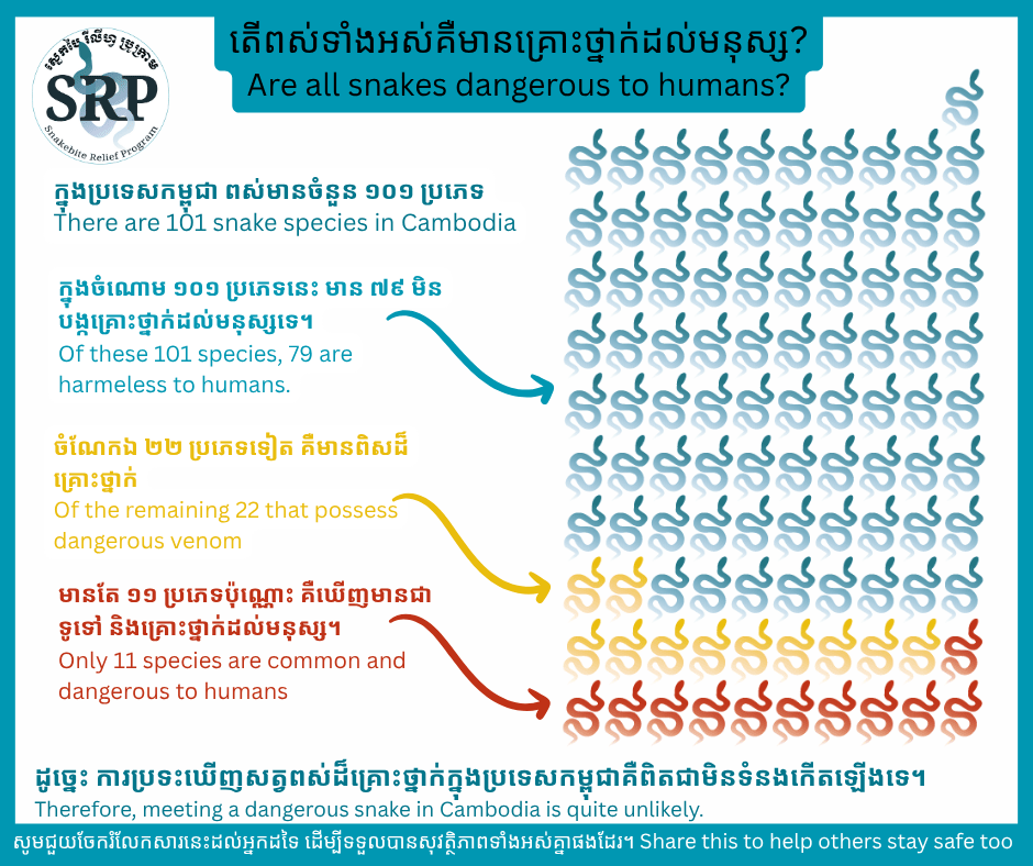 Of these 101 species, 79 are harmeless to humans.Of the remaining 22 that possess dangerous venom, only 11 species are common and dangerous to humans.Therefore, meeting a dangerous snake in Cambodia is quite unlikely!