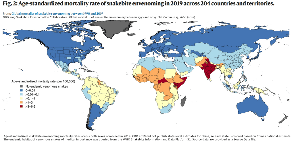 WHO (World Health Organization) estimates around 100,000 snakebite deaths per year in developing countries, largely under reported.